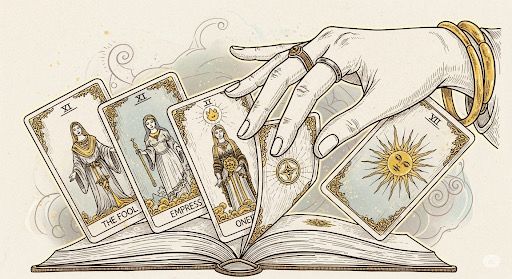 Para mim, o Tarot é mais do que um instrumento de adivinhação (palavra que sempre me soou redutora). Ele é uma tecnologia simbólica, uma arte de ver e de escutar camadas invisíveis. É onde minha formação em comunicação e semiótica se entrelaça com minha prática intuitiva: cada carta é um signo, mas também é um espelho.